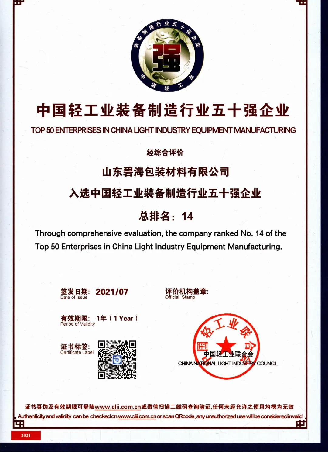 2021年7月20日,在北京召開的“奮進(jìn)‘十四五’領(lǐng)航新消費(fèi)”中國(guó)輕工業(yè)百?gòu)?qiáng)企業(yè)高峰論壇上,碧海公司入選中國(guó)輕工業(yè)裝備制造行業(yè)五十強(qiáng)企業(yè)(排名14)、中國(guó)液態(tài)食品機(jī)械行業(yè)十強(qiáng)企業(yè)(排名4),這是對(duì)我公司綜合實(shí)力、創(chuàng)新成就的高度肯定和認(rèn)可。