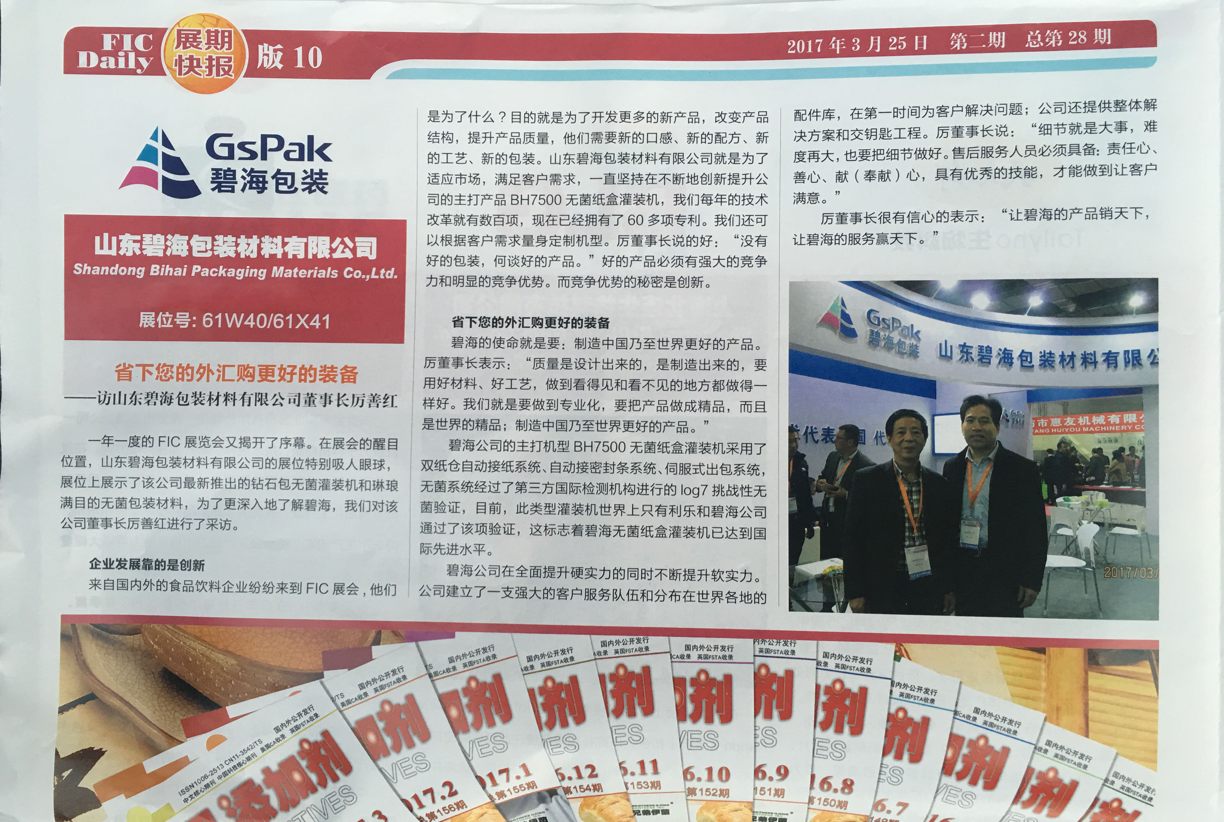 來自國內(nèi)外的食品飲料企業(yè)紛紛來到FIC展會,他們是為了什么?目的就是為了開發(fā)更多的新產(chǎn)品,改變產(chǎn)品結(jié)構(gòu),提升產(chǎn)品質(zhì)量,他們需要新的口感、新的配方、新的工藝、新的包裝。山東碧海包裝材料有限公司就是為了適應(yīng)市場,滿足客戶需求,一直堅(jiān)持在不斷地創(chuàng)新提升公司的主打產(chǎn)品BH7500無菌紙盒灌裝機(jī),我們每年的技術(shù)改革就有數(shù)百項(xiàng),現(xiàn)在已經(jīng)擁有了60多項(xiàng)專利。我們還可以根據(jù)客戶需求量身定制機(jī)型。厲董事長說的好:“沒有好的包裝,何談好的產(chǎn)品?!焙玫漠a(chǎn)品必須有強(qiáng)大的競爭力和明顯的競爭優(yōu)勢。而競爭優(yōu)勢的秘密是創(chuàng)新。